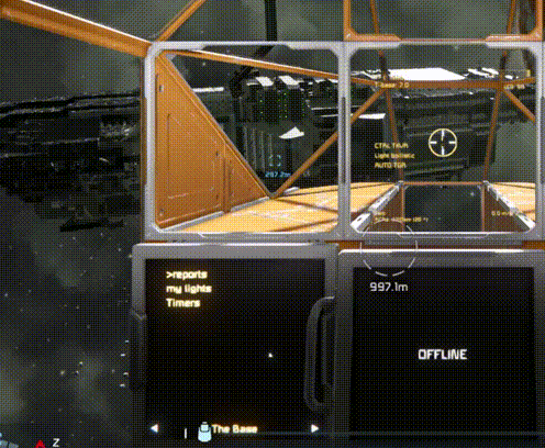 Powering the ship are 2 Small reactors, 8 Large batteries and 67 small batteries (yeah) giving a flight time of around 30 minutes in atmosphere with connection ports in the Top, Bottom and Rear of the ship for external re-arm and recharging.
